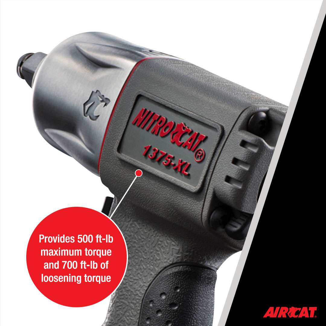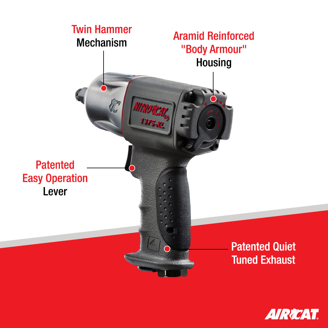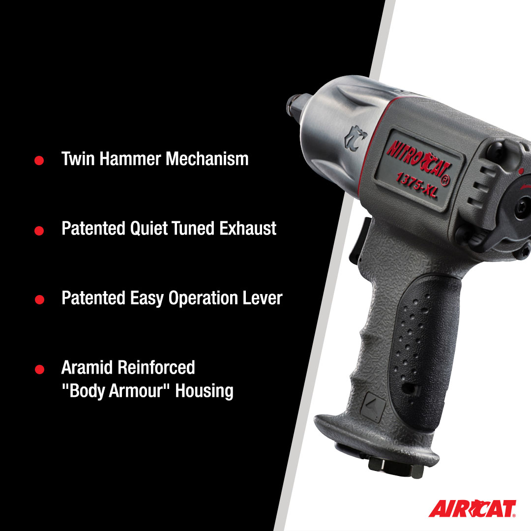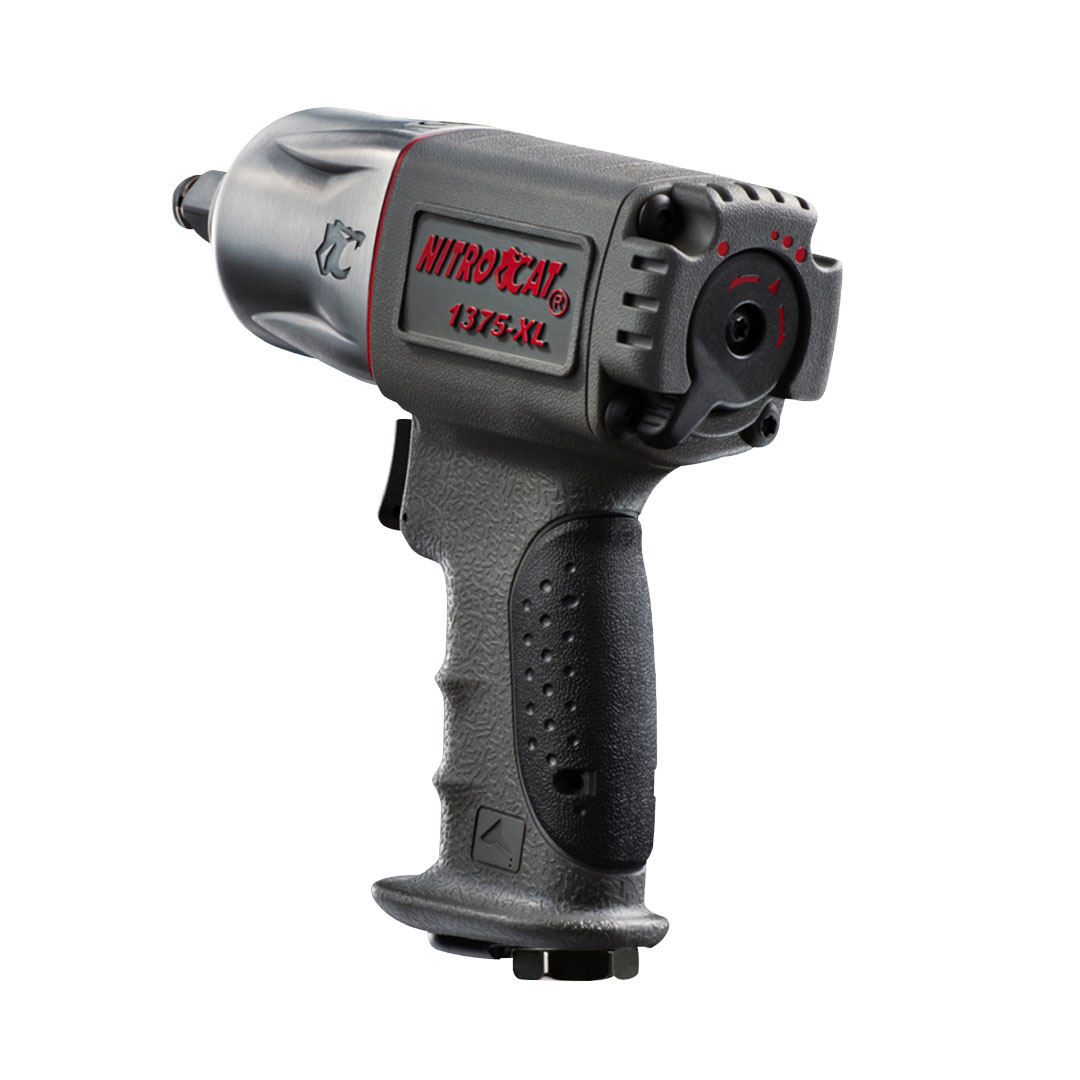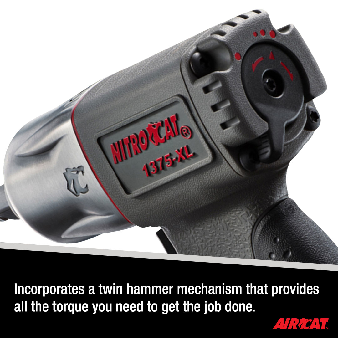 The NitroCat 1375-XL is a no non-sense, hard hitting 1/2″ impact wrench that incorporates a twin hammer mechanism. The 1/2 in. Compact “Extreme Power” Impact Wrench is ideal for heavy duty automotive applications such as brake calipers and transmission work where tight access is required. It features the most significant advances in the performance of pneumatic power tools in nearly 30 years.