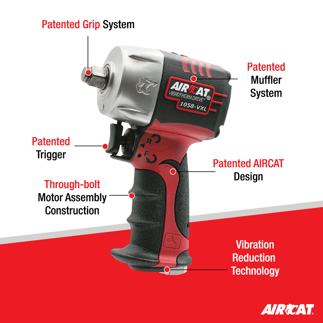 VIBROTHERM DRIVE® impact wrenches incorporates the new patented AIRCAT design impact wrench mechanism. The new mechanism reduces vibration levels by 30%-40% and increases the life of the mechanism by 50%.