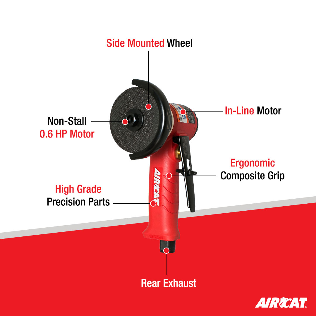 Side mounted wheel and in-line motor allows for straight cutting of materials. Manufactured from high grade material precision parts designed for industrial and heavy duty automotive use.