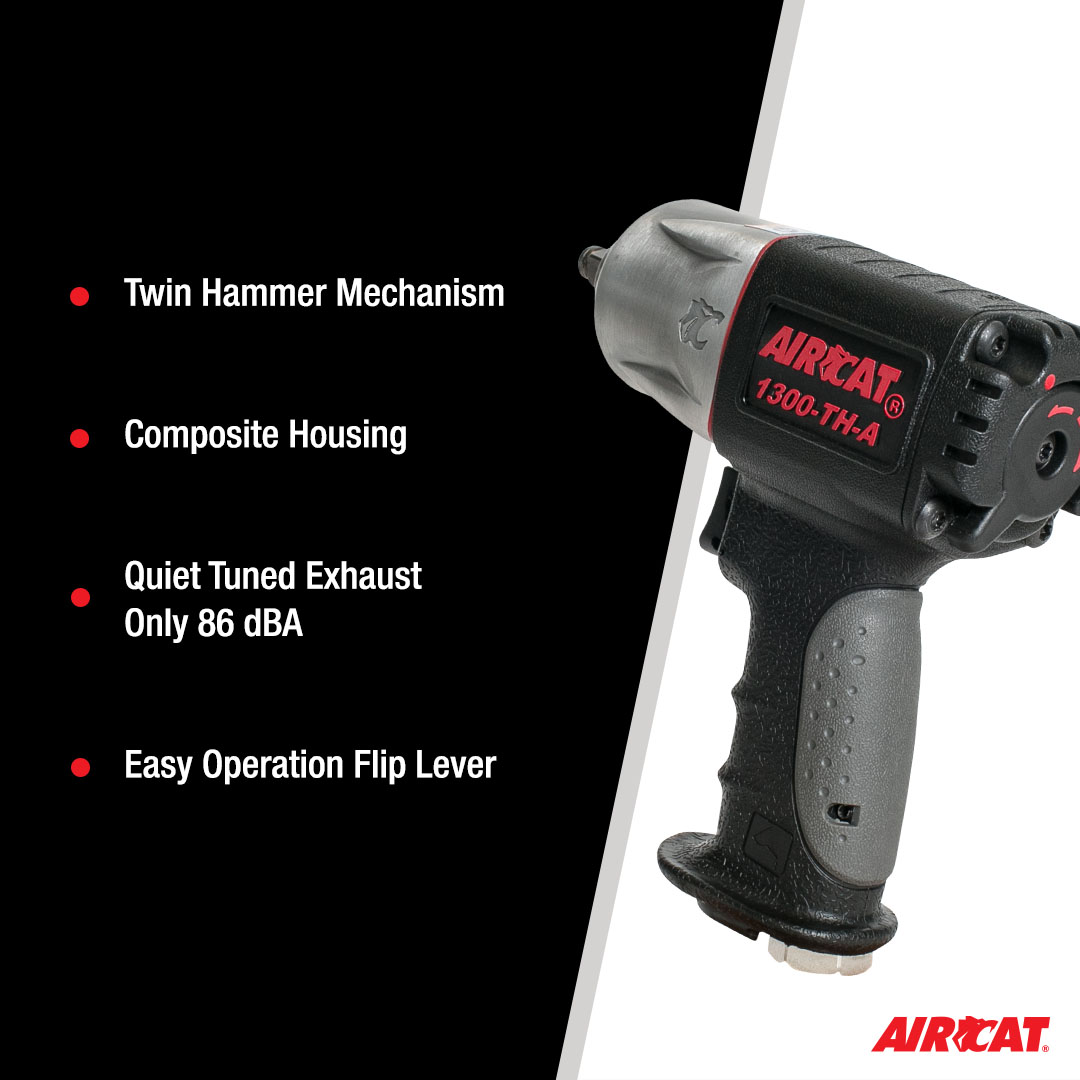 The AIRCAT 1300-TH-A uses the rugged and reliable twin hammer mechanism, well suited for all-around automotive use.