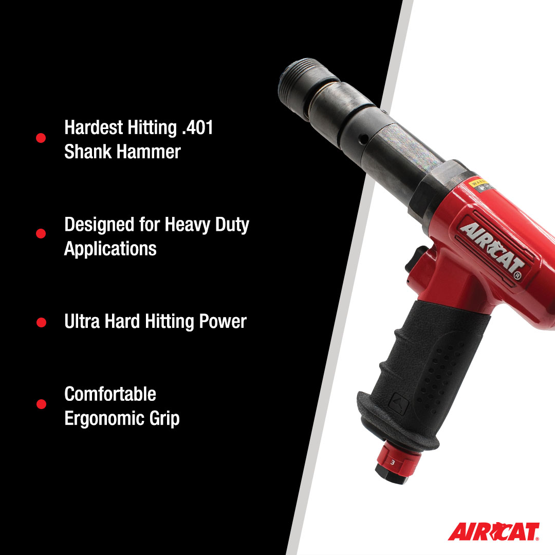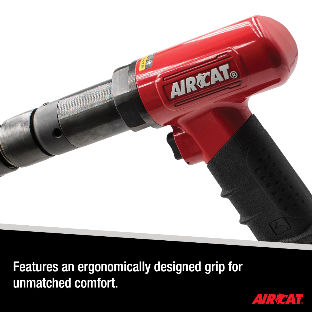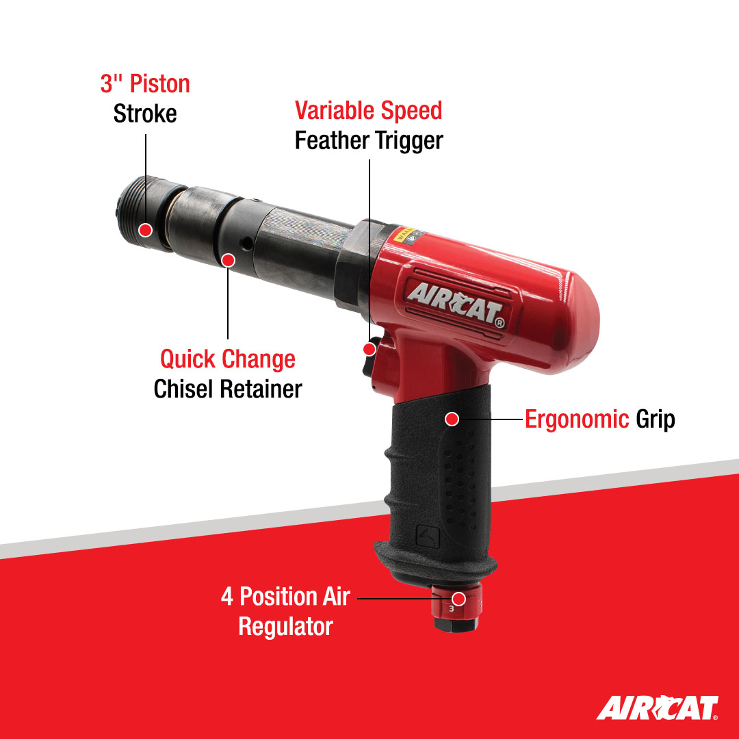 Includes Quick change chisel retainer. Variable speed trigger with 4-position built-in air regulator.