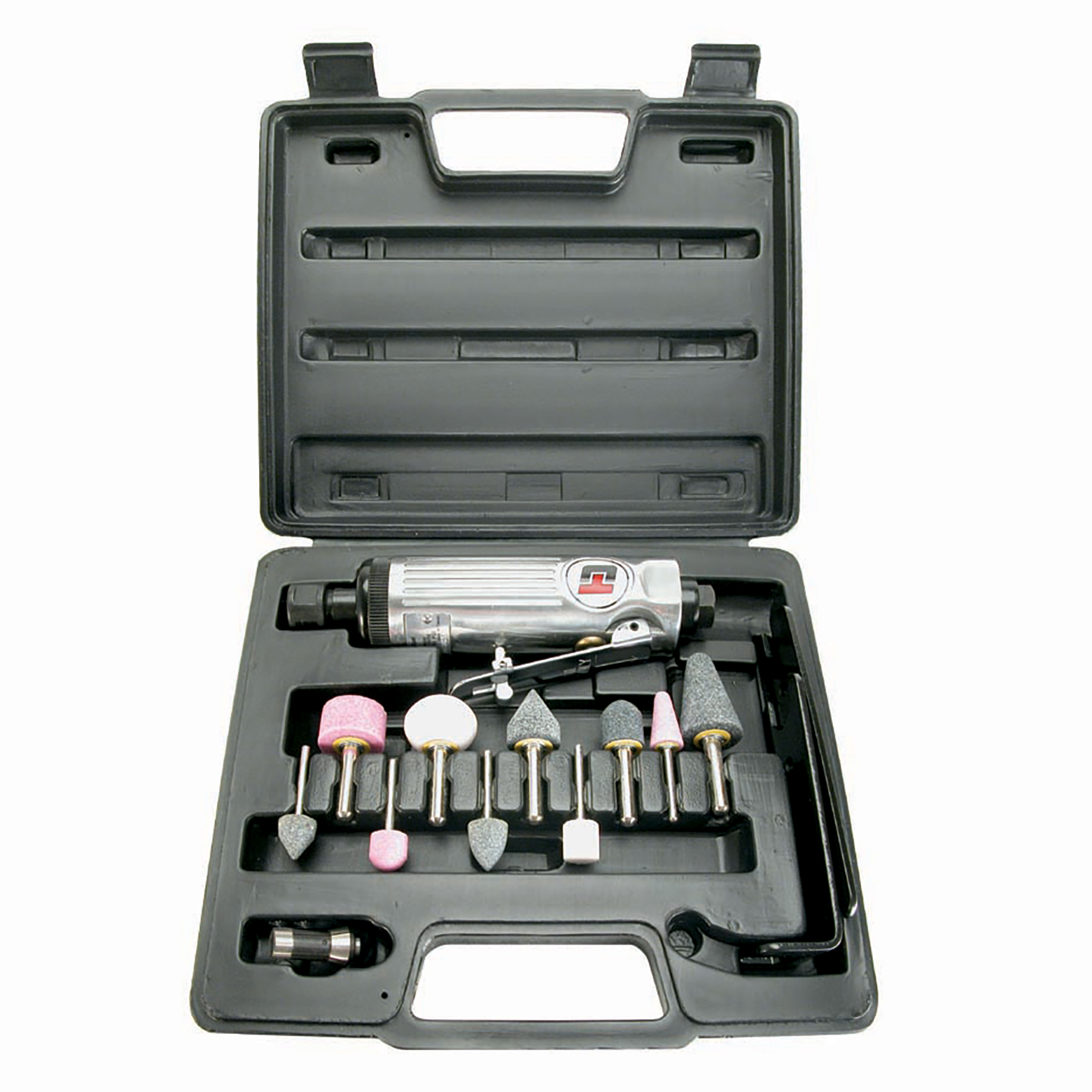 Universal Tool UT2720K Die Grinder Kit includes the UT2720 die grinder complete with both 1/4″ & 1/8″ collets and a set of five each 1/4″ & 1/8″ mounted stones. Ideal for general intermittent grinding and deburring.
