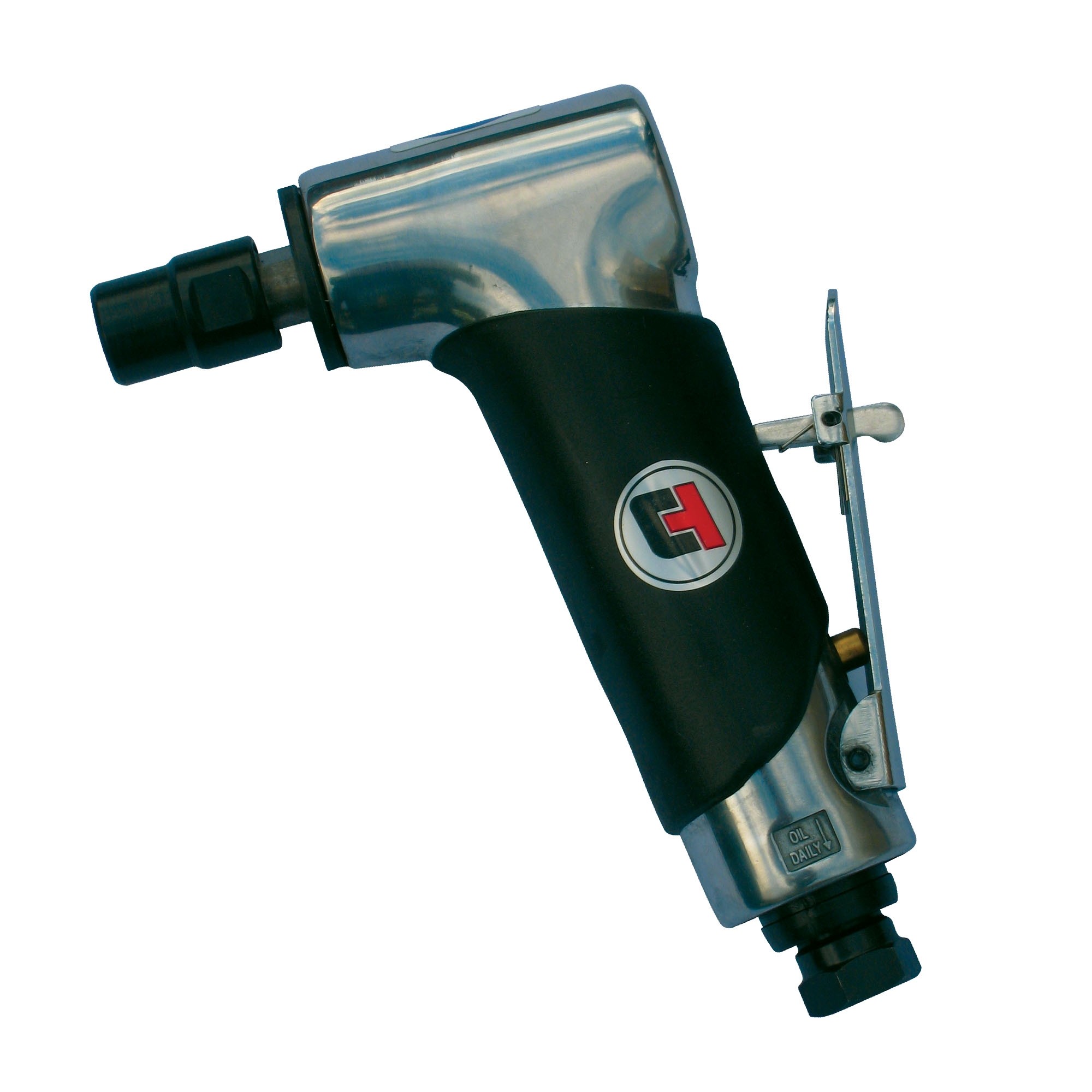 Universal Tool UT8777C-1 Gearless Angle Die Grinder features a gearless head for longer tool life, cushion grip, low-profile lock-off throttle, low weight design, low vibration, and rear exhaust. Ideal for precision grinding and extended use.